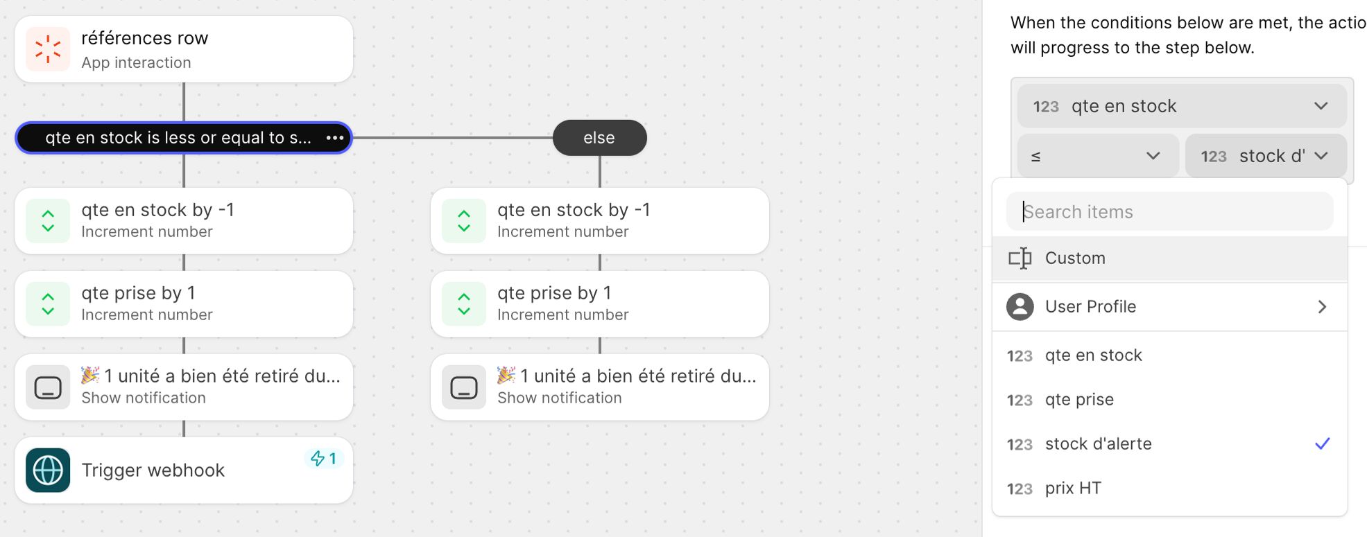 In other words, when I click a button to remove one item from the stock, if quantity becomes too low (quantity alert), I want to be notified (Webhook).