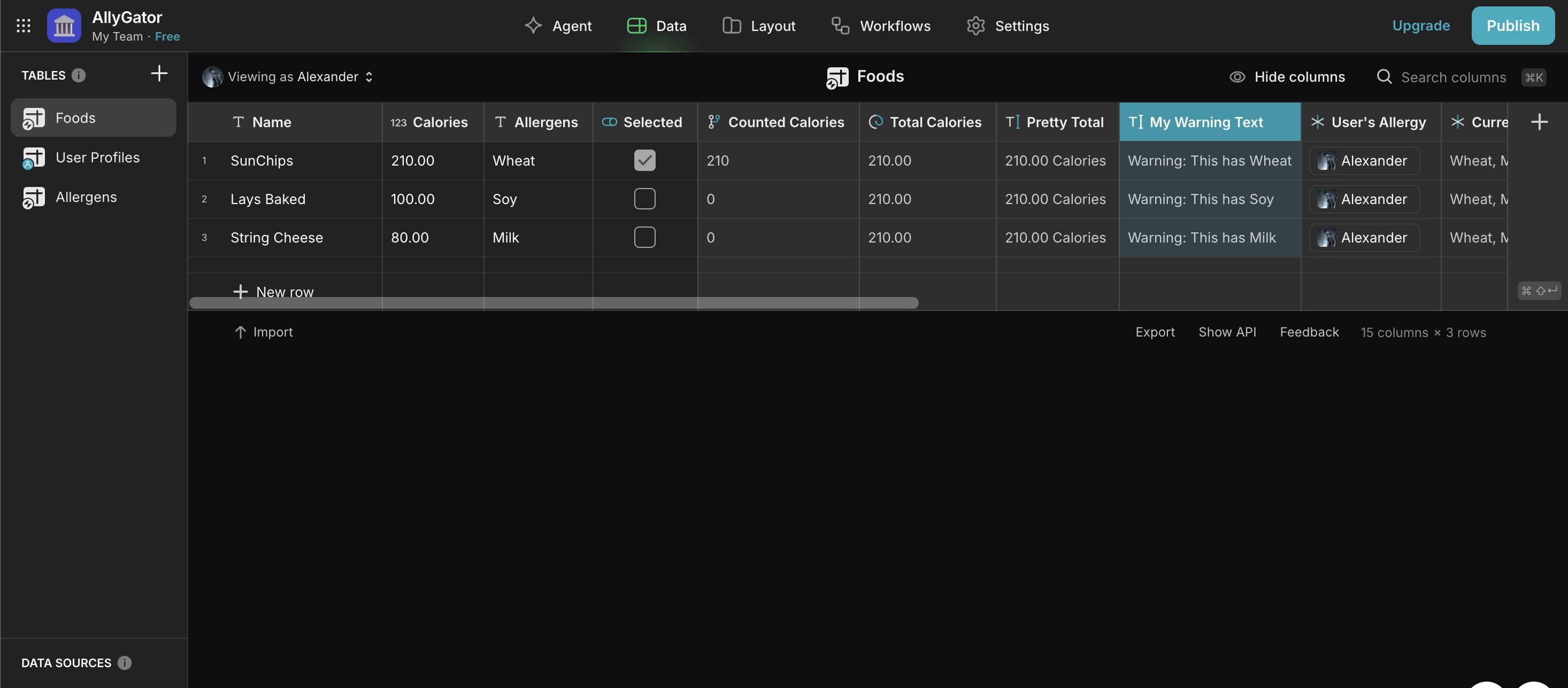 I want to show a warning component (text/image) on a Food Item’s details screen ONLY IF the food contains an allergen that the current user has selected in their User Profile.
