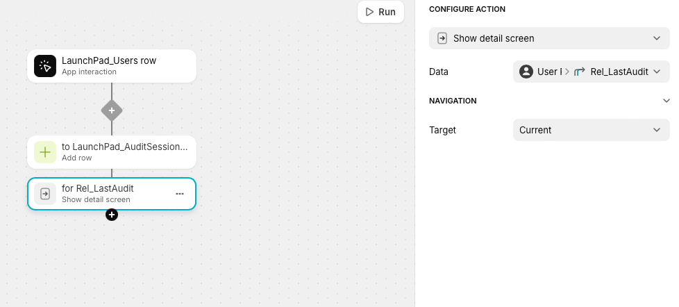 I have a simple 3 Action Workflow for a “New Audit” button. Action 1: Adds a Row and sets values (CreatedBy, Created At, Etc), Action 2: is supposed to reference the Row that is created in step 1. Action 3: Shows the detail page to actually perform the audit. The guidance via ChatGPT is to have Action 2 set Data.Users.USLastAuditID with the Row ID created in Action 1.
