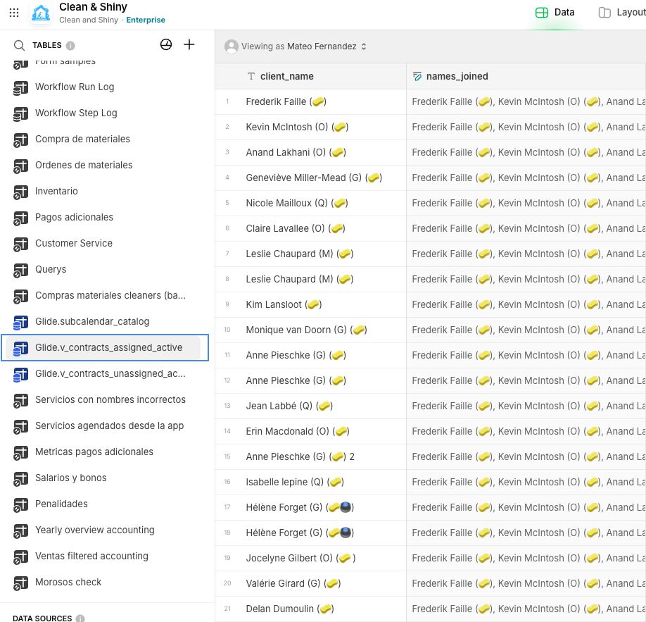 Goal: I want to get all the client_name values from the external DB, transform them into something Glide can handle (array / JSON / joined text), and then “unwind” them into a native Glide Table using the index trick / helper table approach.