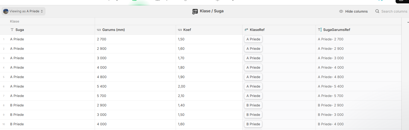 - Glide shows me all the rows from Klase/Suga instead of just the matching one (e.g., “A Priede - 4000”).
