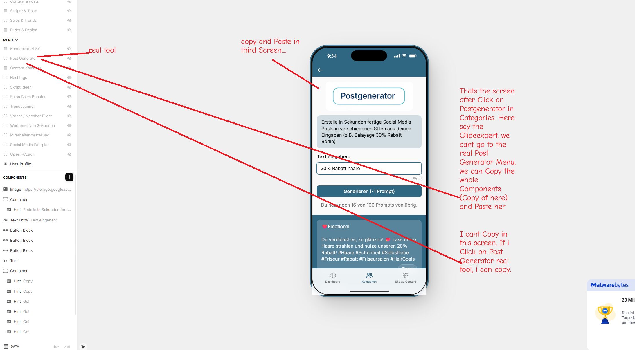 His suggestion was to manually copy the components of my existing tools (from the left side menu) into the respective screens (see image 3). I tried this, and it worked at first, but two major issues appeared:
