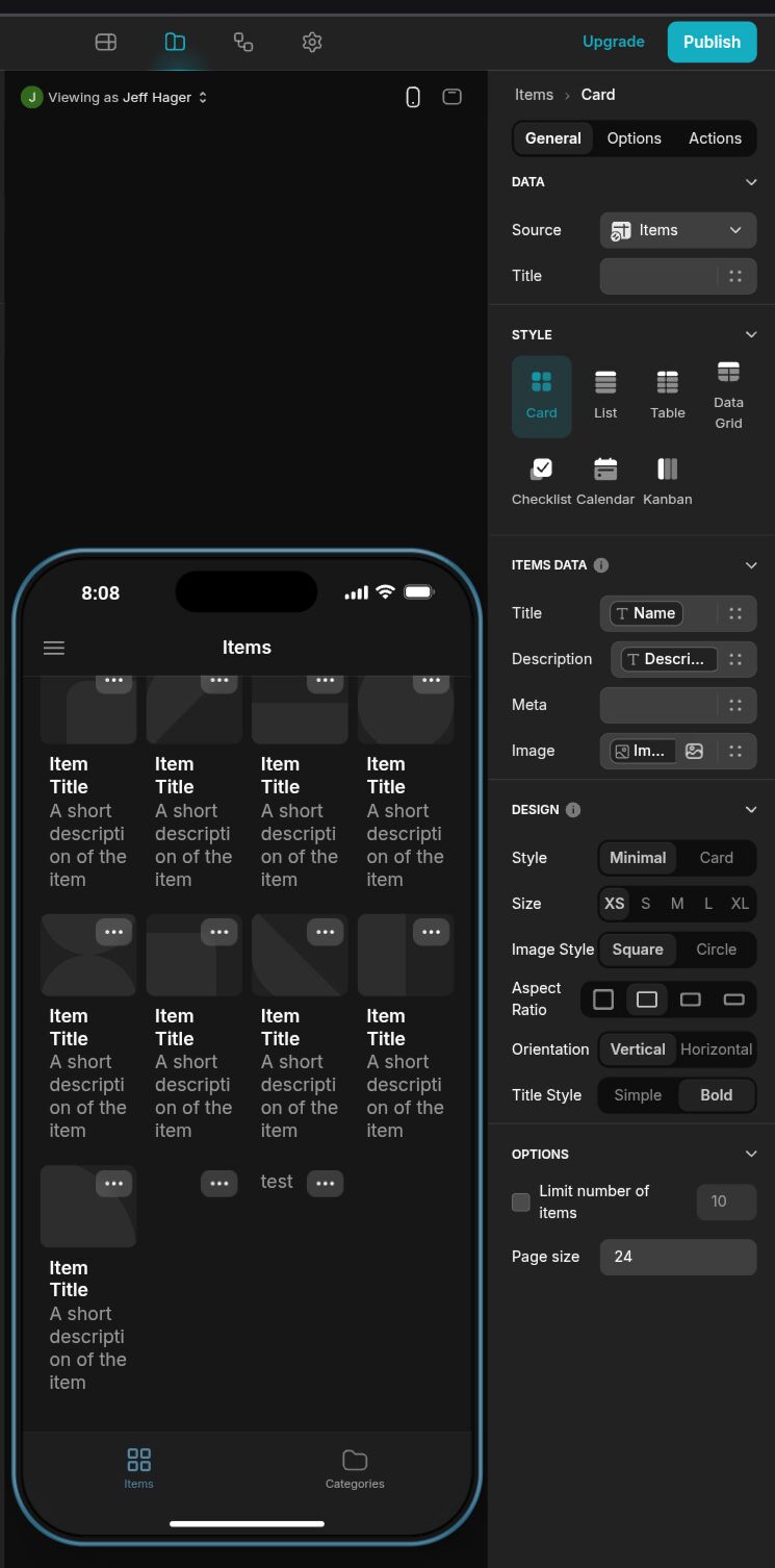 Regardless, if you want a card collection, be sure to add a new component to the screen and select Card instead of Container. A container should not be applicable to what you are trying to do here.