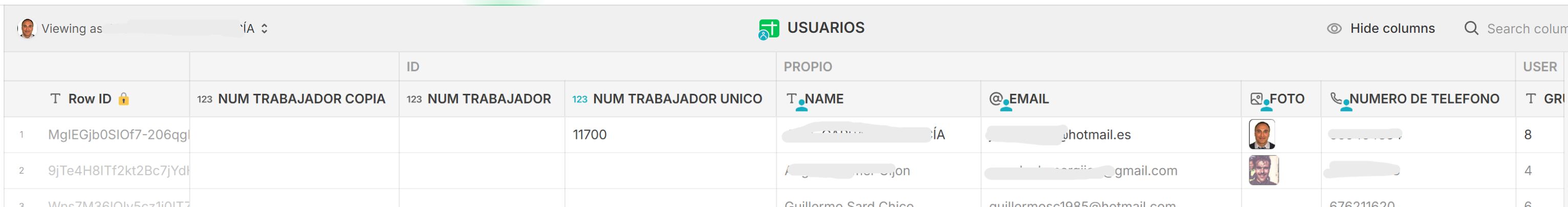 pongo una foto de como lo veo, porque creo que no me exprese bien, como administrador uso el perfil de un usurario que soy yo y en la la columna “NUM TRABAJADOR UNICO” que esta creada como “User Specific” veo mi num de trabajador, pero no el de resto, sin embargo el resto de columnas como son “NAME”, “EMAIL”, “FOTO”, “NUMERO DE TELEFONO”, tambien estan como “User Specific” pero como administrador si que veo los datos de cada fila de usuario, solo es en la columna de numero de trabajador que no lo puedo ver.