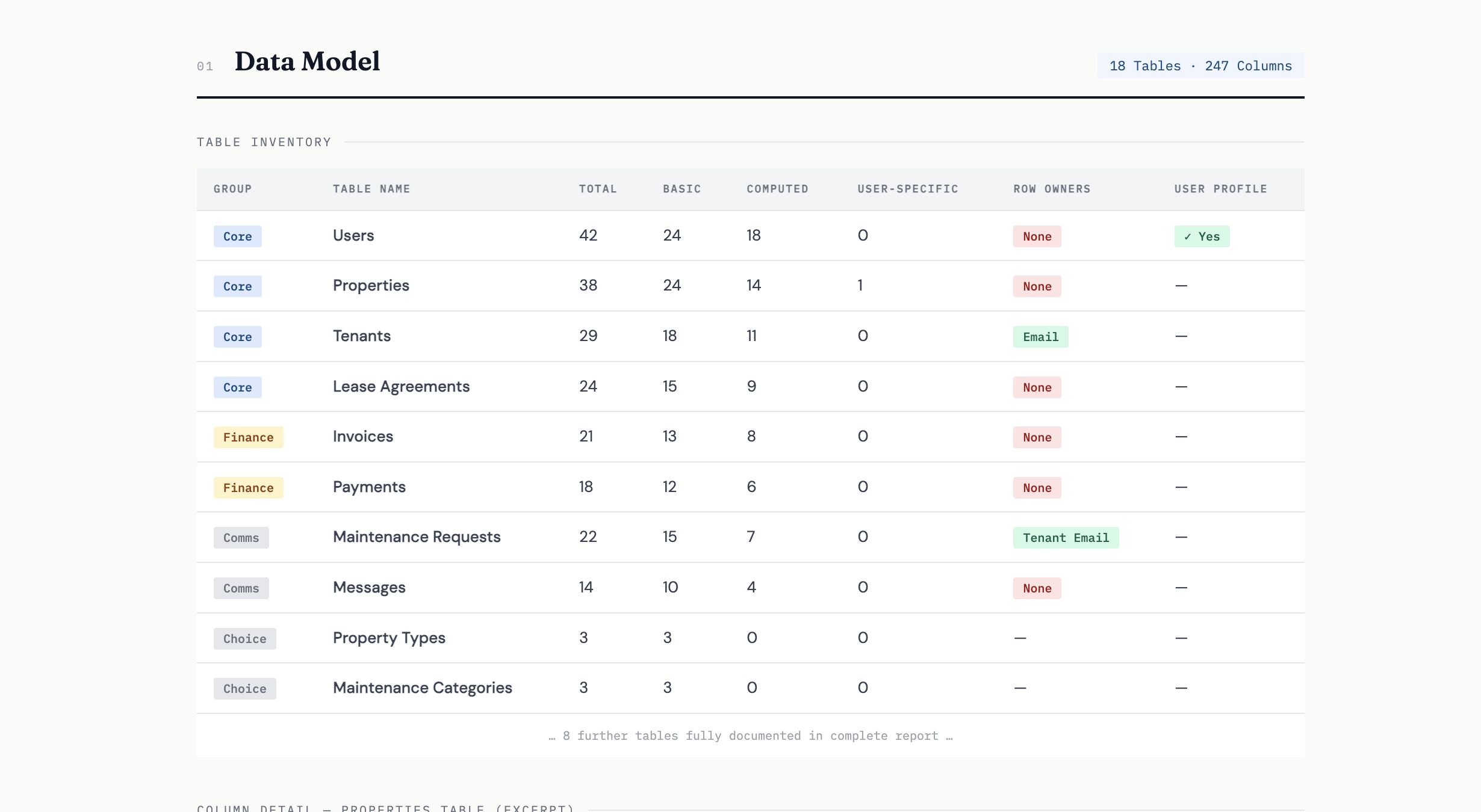 Every column: name, type, category (basic / computed / user-specific), whether it’s required or protected