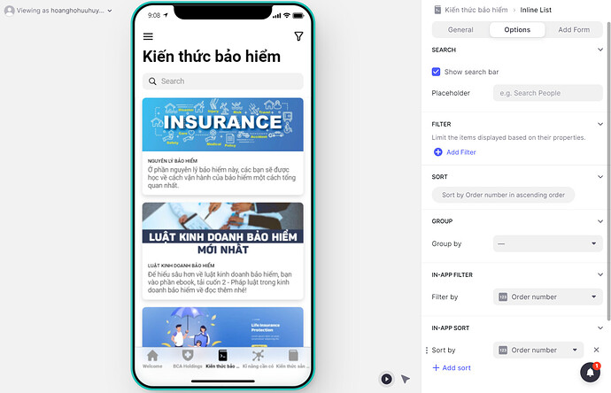 Please show me the configuration settings of your Inline list component - in particular the “Sort” setting.