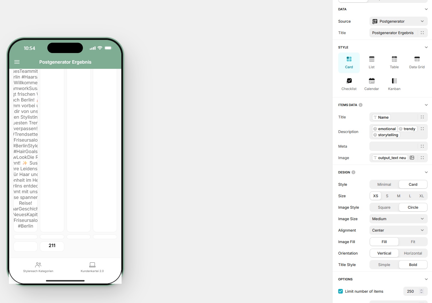 The customer is supposed to provide input, and the app should generate a response via AI with many different answers. There are several problems here. If I just use a rich text component, it results in a lot of text and becomes very confusing. I’ve now discovered “Hints,” which look a bit more structured thanks to the frames, but unfortunately only specific frame colors are available. I tried solving this with 6 containers and 6 rich texts, but the background colors of the containers aren’t particularly good either. Why is Glide so limited here?