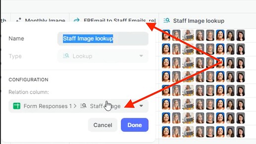 I’m using a lookup to lookup an email in another tab using a relation, but it’s returning the same image for all staff members. Any idea on what I’m doing wrong here setting this up?