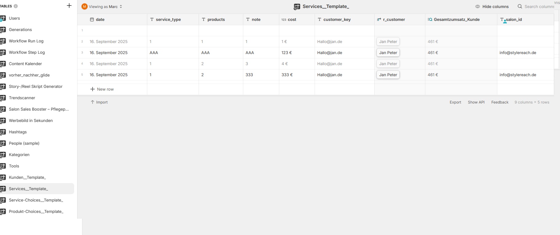 - date, service_type, products, note, cost, customer_key, salon_id (Row Owner)