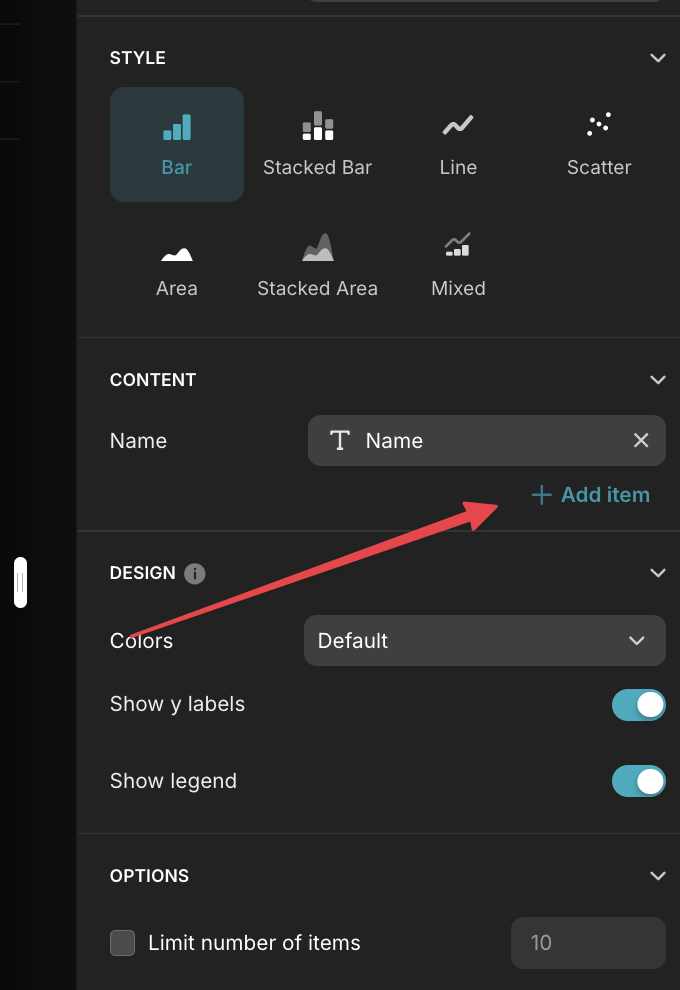 But adding an item only allows you to create another series on the same axis. It doesn’t actually open a y axis and there’s no option to do so.