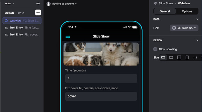 WARNING: to integrate the SlideShow, I use the webview component, so you must have a pro package for this to work in publication !!!
