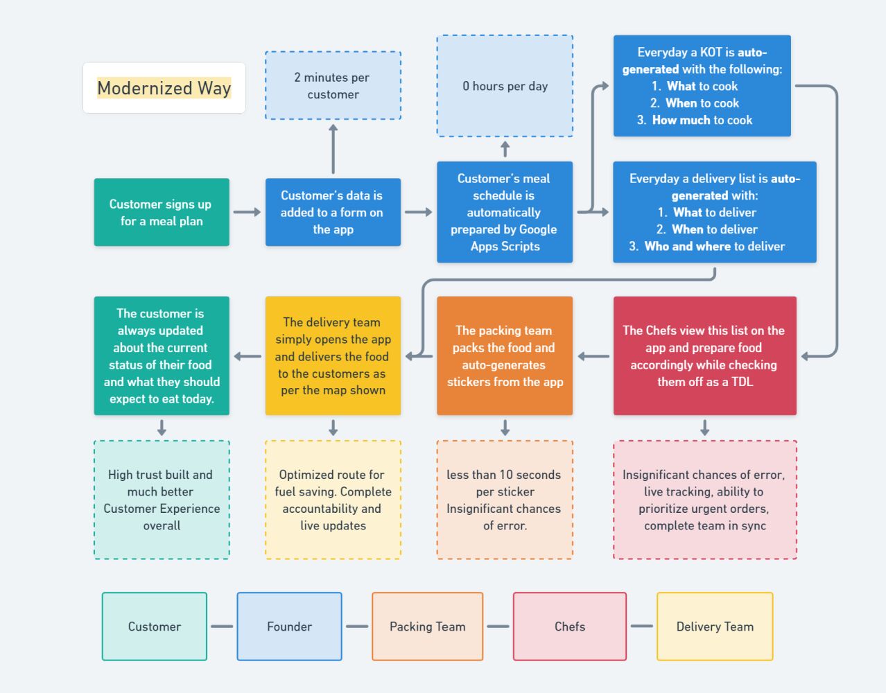 Stakeholders involved: Founder, Chefs, Packing team, Delivery team, Customers, Accounts
