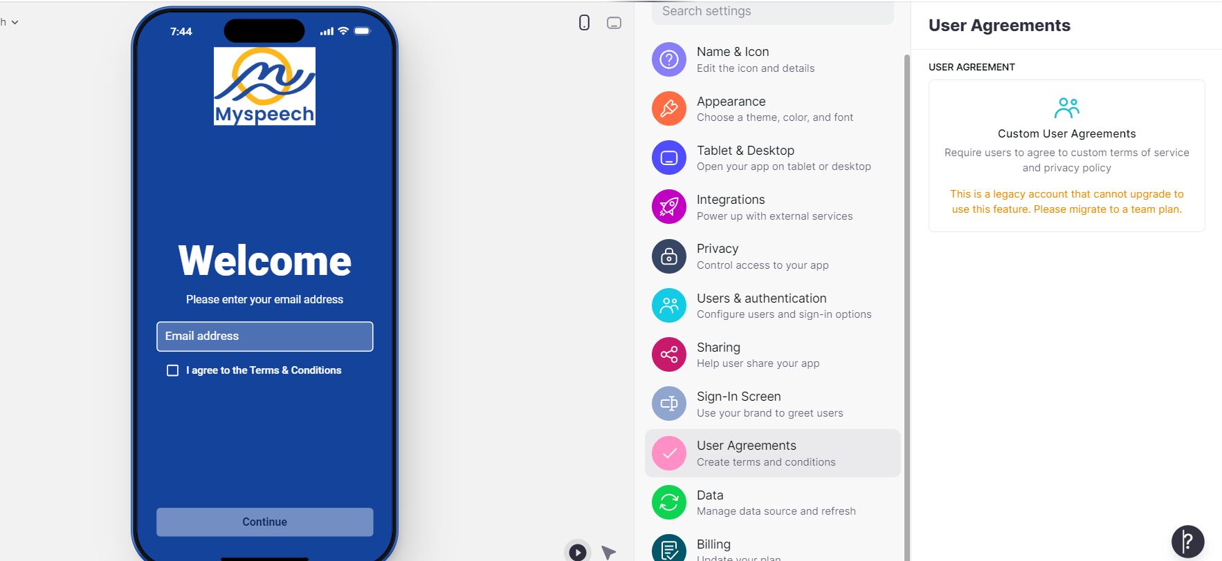 I am trying to remove the terms and condition checkbox on my web app, but it seems that I cannot do it as the screen shows this message: “This is a legacy account that cannot upgrade to use this feature. Please migrate to a team plan glide.”
